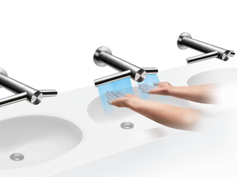 De Dyson Airblade Wash + Dry is een innovatieve handdroger die geïntegreerd is in een sensor-gestuurde kraan. Het droogt de handen in slechts 14 seconden met behulp van HEPA-gefilterde lucht. Dit multifunctionele ontwerp bespaart ruimte en voorkomt dat er water op de vloer druppelt wanneer gebruikers naar een aparte handdroogoplossing moeten gaan na het gebruik van de wastafel.