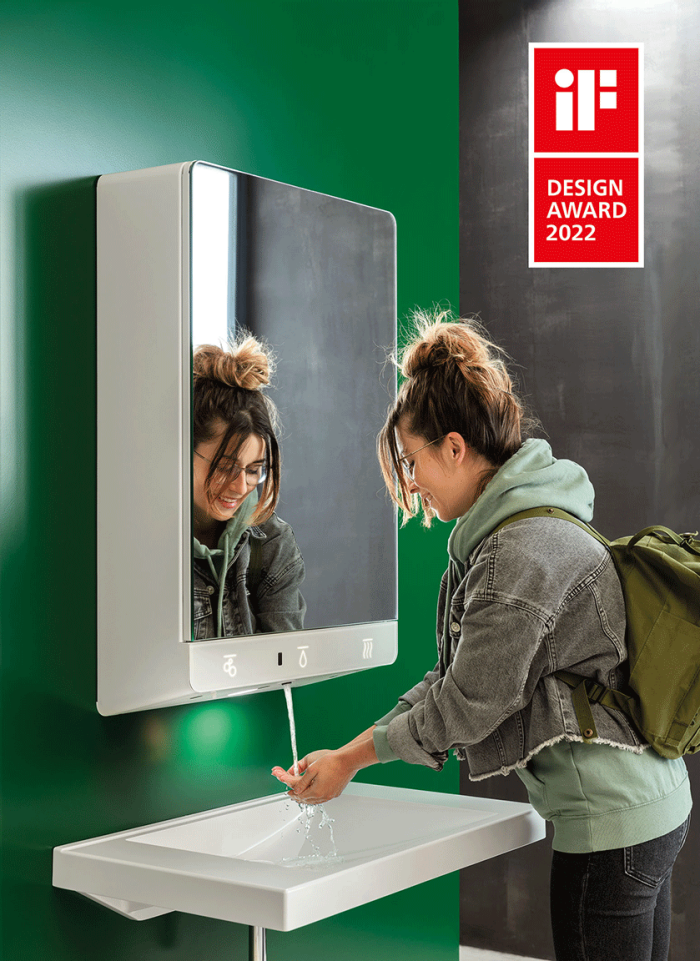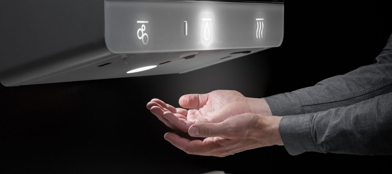 Een balkje licht op zodra de sensor een naderende gebruiker opmerkt. Automatisch verlichte symbolen begeleiden de gebruiker langs verschillende functies. Bovendien schijnt er een spotlight op je handen die van het handen wassen een heuse beleving maakt.