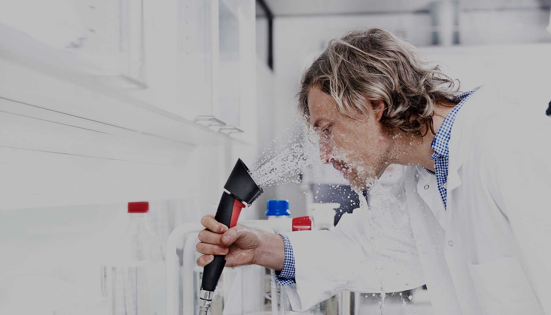 - Positioneer jezelf voor de oogdouche, buig voorover en open uw ogen wijd.