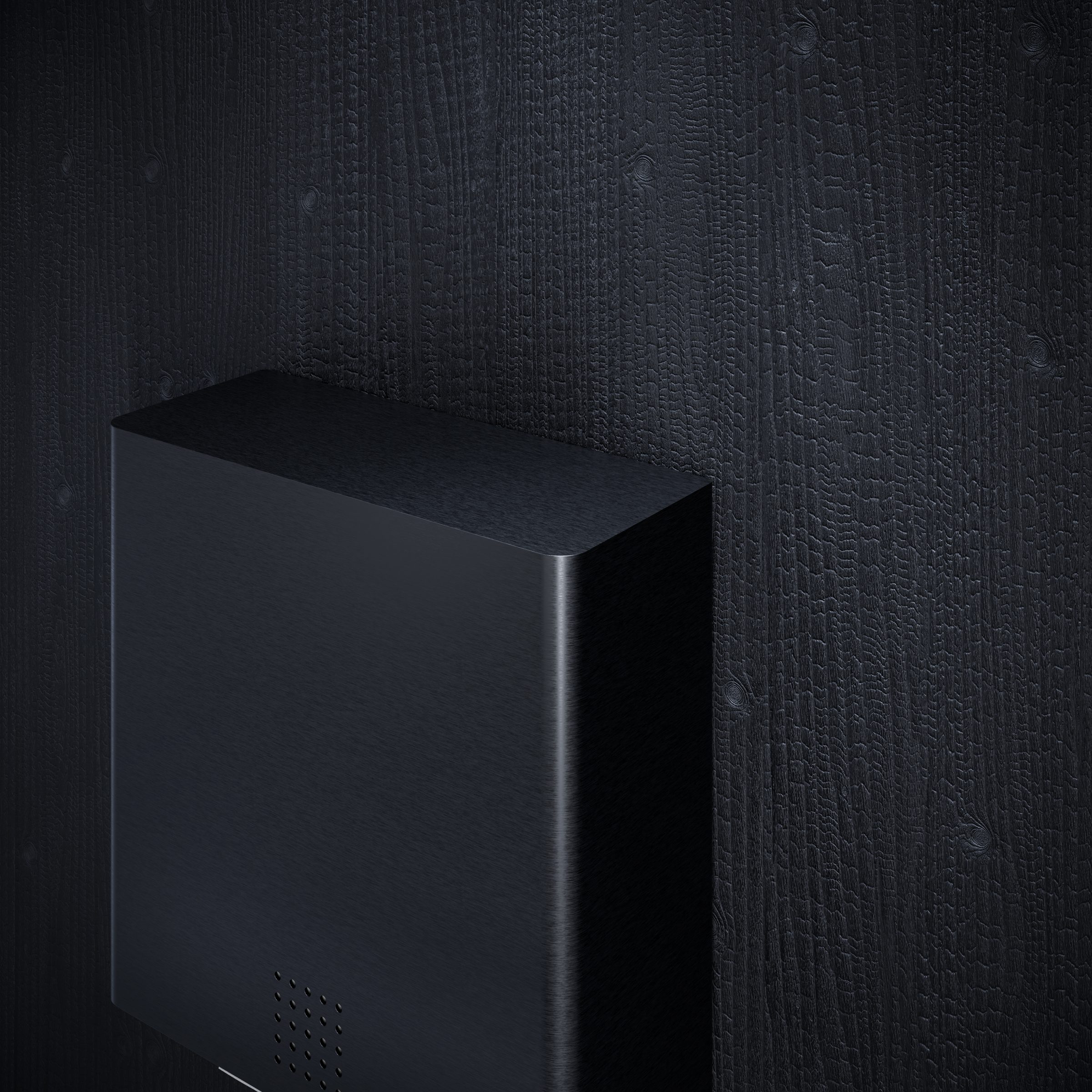 Geslepen roestvrij staal veredeld in het PVD proces in de kleur Charcoal. In perfecte harmonie met verkoold Yakisugi hout.