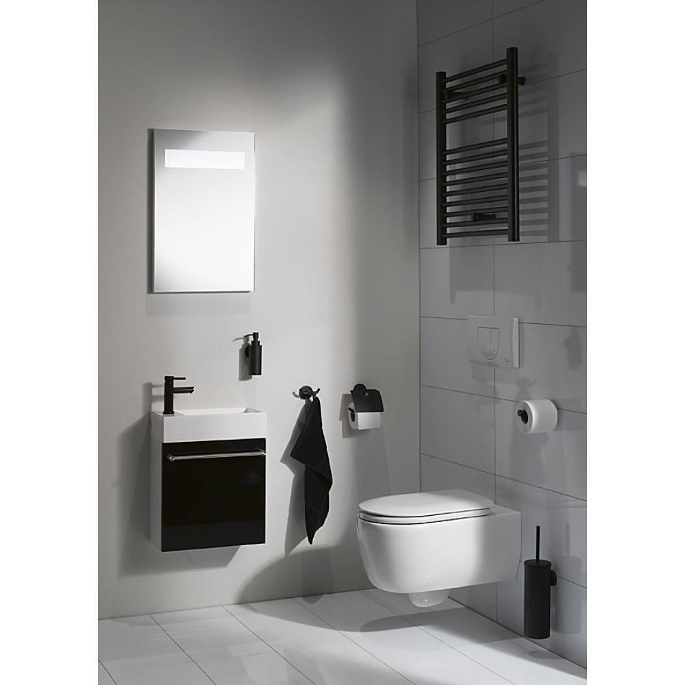 Haceka zwarte wastafel met zilveren kraan en zwarte zeepdispencer