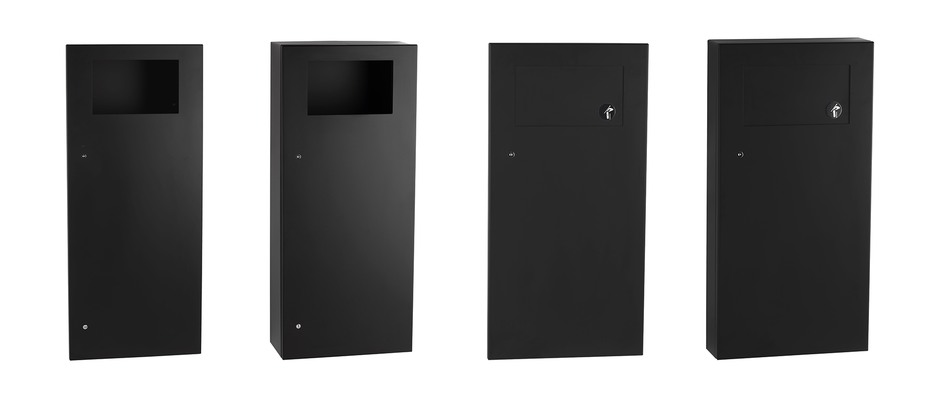 • B-35643 inbouw open afvalbak – Matzwart gepoedercoat roestvrij staal met volledig gelaste constructie. Verzonken sloten. De deur is aan de kast bevestigd met een verborgen roestvrijstalen pianoscharnier over de hele lengte, deurzwenkbegrenzer met kabel en voorzien van twee tuimelsloten met sleutel zoals andere Bobrick-items. Verwijderbare, lekvrije afvalbak met een capaciteit van 45,5 liter.