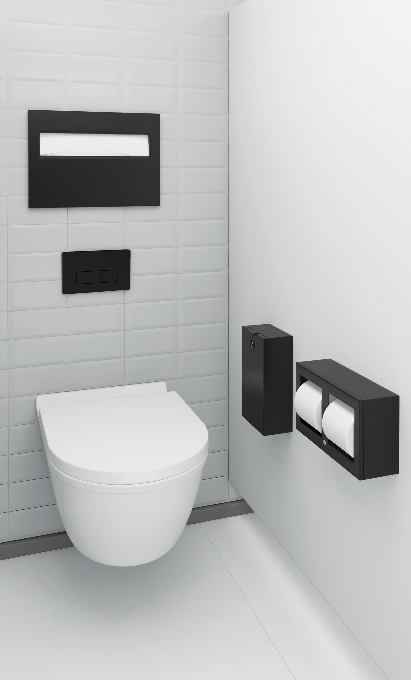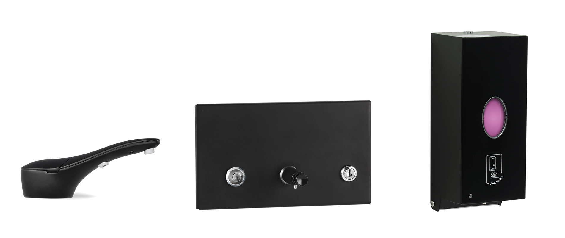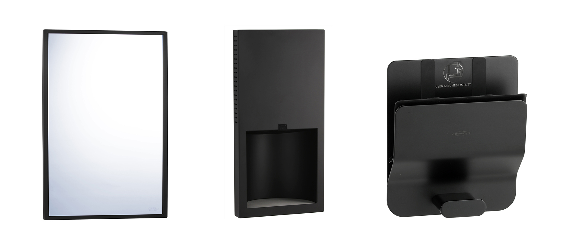 • B-3588 – Opbouw toiletpapierdispenser – Matzwarte gepoedercoate roestvrijstalen unit met volledig gelaste constructie. Verzonken slot. De unit is diefstalbestendig en voorzien van een tuimelslot met sleutel zoals andere Bobrick-toiletaccessoires.