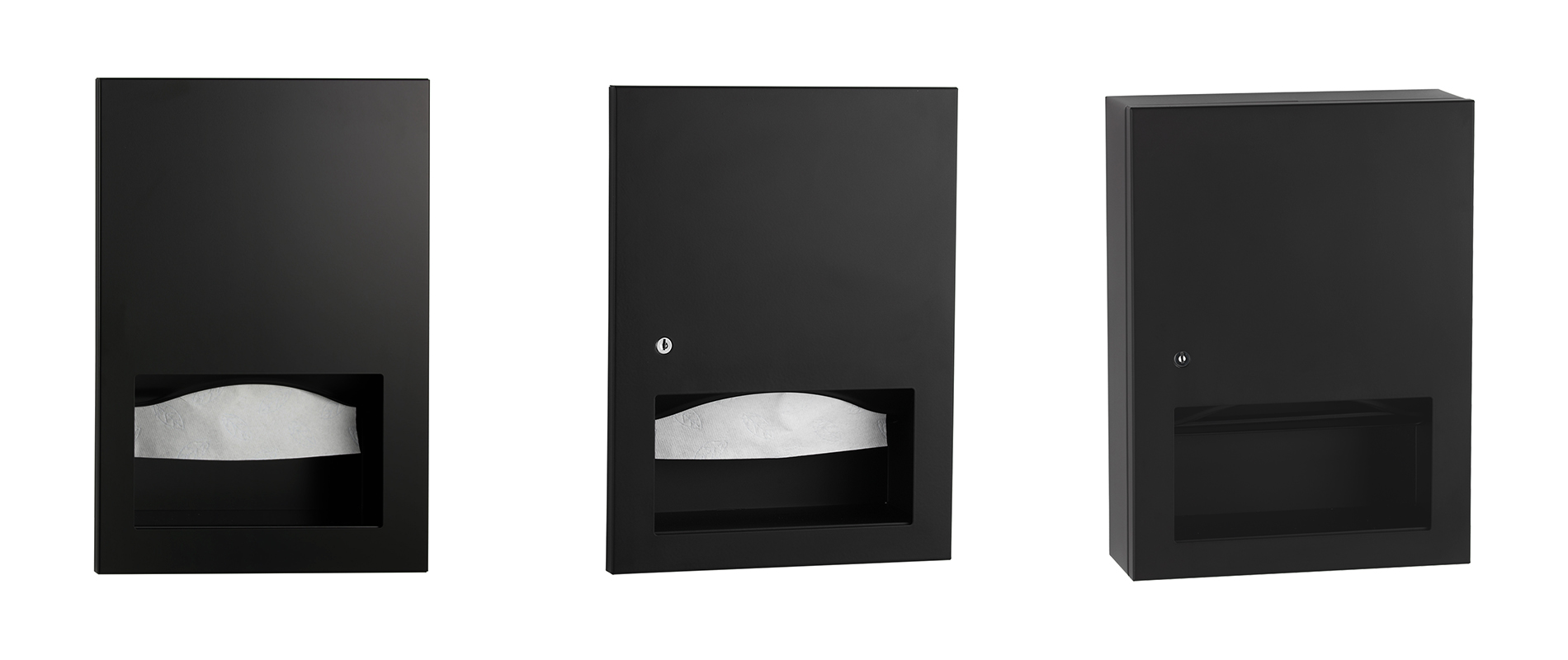 • B-3013 – Inbouw dispenser voor toiletbril papier – Matzwart gepoedercoat roestvrij staal. Verzonken slot. Deur heeft 90° terugloop, verbergt flens. Dispenser voor 500 toiletbrilhoezen.