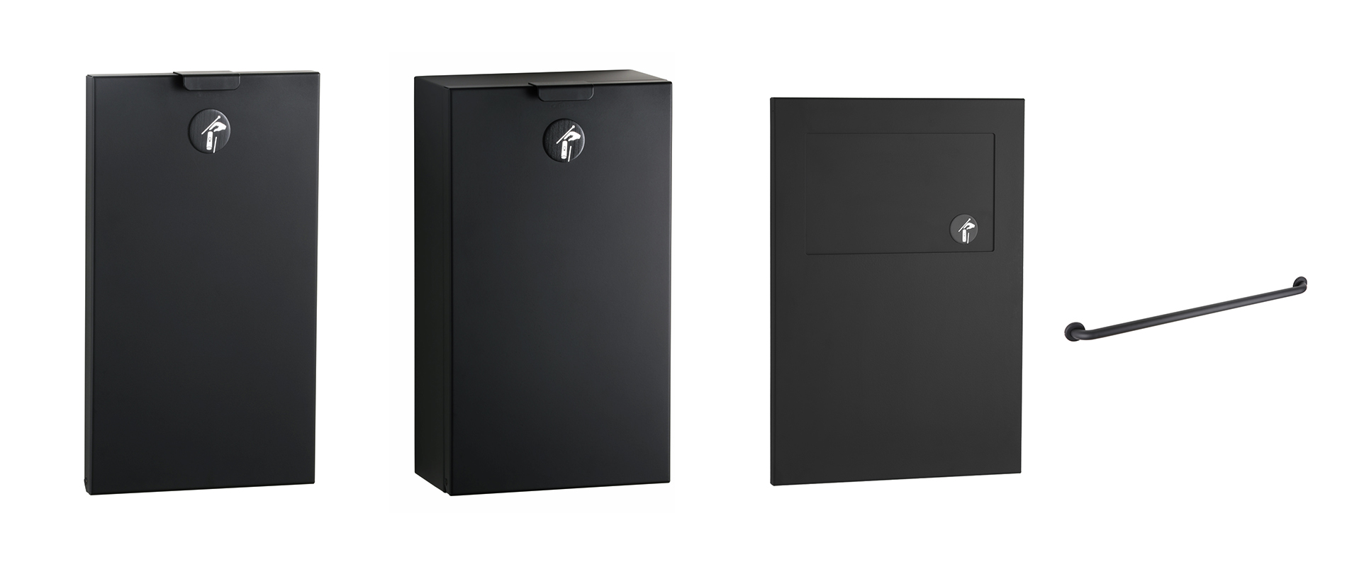 • B-3513 – Inbouw dameshygiëne afvalbak – Inbouwunit met matzwarte poedercoating van roestvrij staal met uitneembare afvalbak. De deur wordt aan de kast bevestigd met een magneetsluiting en deurzwenkbegrenzer met kabel. Afvalbak heeft een capaciteit van 2,3 liter.