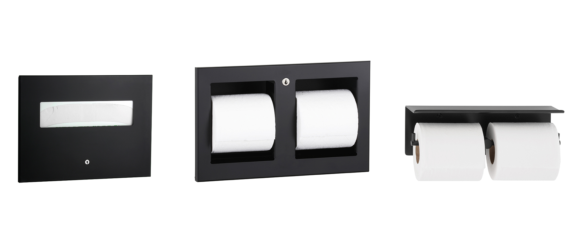 • B-35883 – Multi-rol toiletpapierdispenser – Matzwarte gepoedercoate roestvrijstalen unit met volledig gelaste constructie. Verzonken slot. De unit is diefstalbestendig en voorzien van een tuimelslot met sleutel, net als andere Bobrick-toiletaccessoires.