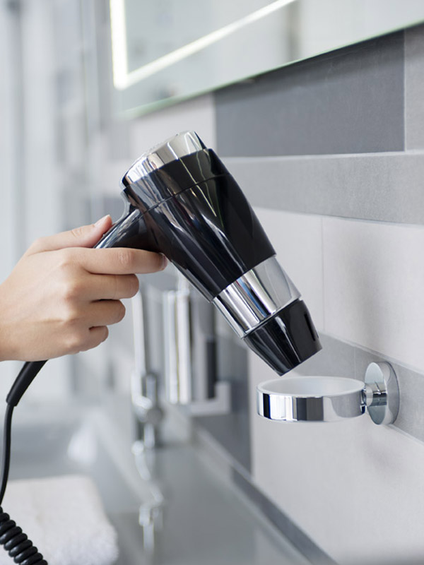 Hoe fijn is dat? Een haardroger die je altijd op dezelfde plaats vindt. Mooi vormgegeven, technisch hoogwaardig, veel extra features. Uitvoering in wit of zwart, met subtiele accenten in chroom.