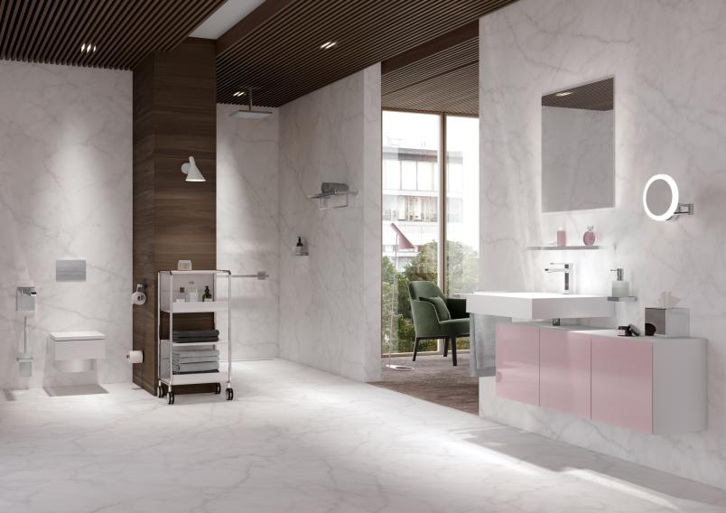 Een architectonisch systeem, dat de consequente vormgeving mogelijk maakt van sanitaire ruimten