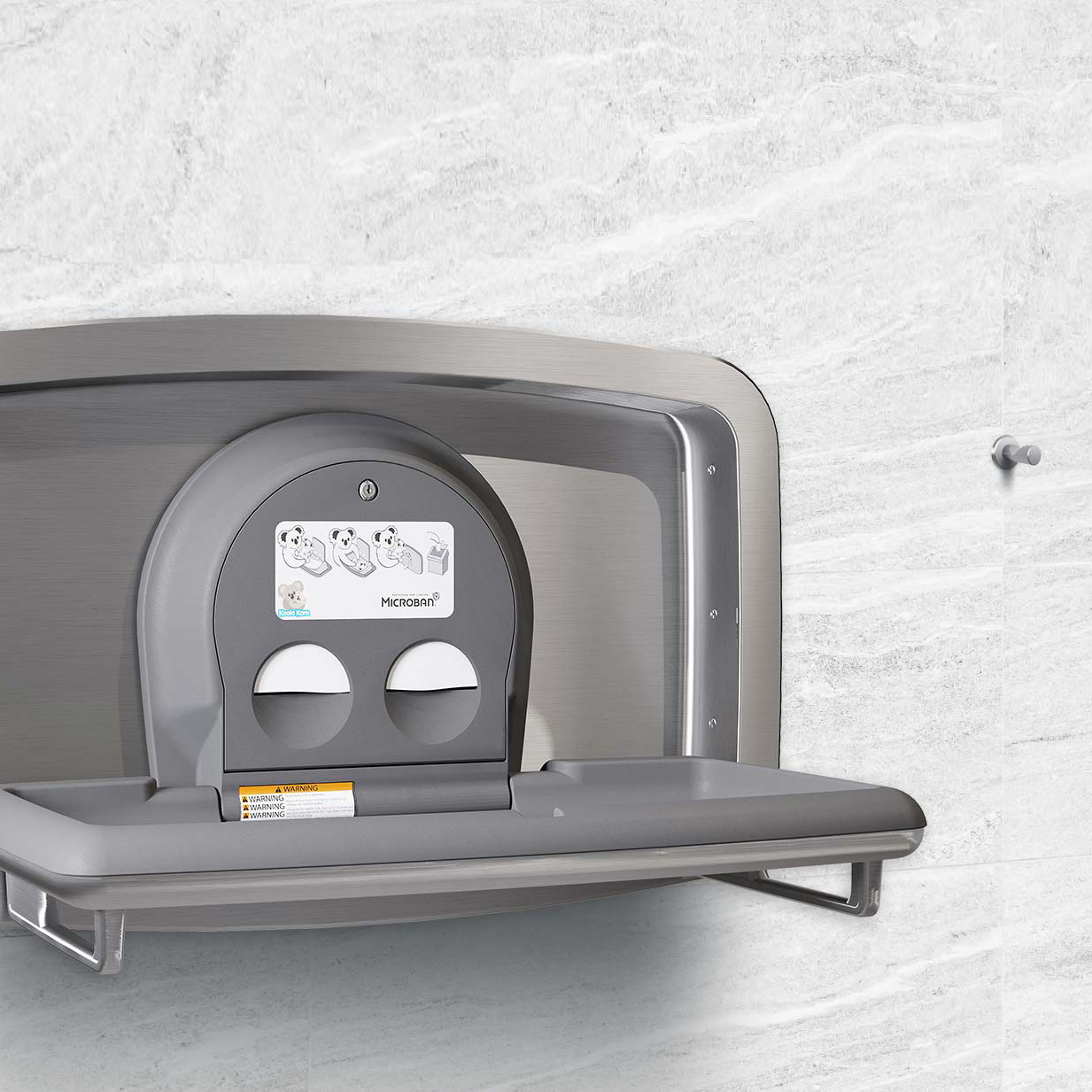 De KB310/KB311 series vertegenwoordigt Koala's investering in ongeëvenaard vakmanschap. De diepgetrokken roestvrijstalen onderdelen uit één stuk elimineren naden, scherpe randen en laslijnen en zorgen voor een moderne visuele esthetiek. Belangrijke productkenmerken zijn ADA- en ASTM-naleving, lasergeëtst logo en een gemakkelijk te laden en te gebruiken dispenser met twee compartimenten voor maandverband en luierzakken. De stations worden geleverd met een op de muur gemonteerde, roestvrijstalen tassenhaak om de toegang tot luierzakken gemakkelijker en veiliger te maken. Het polypropyleen bedoppervlak bevat de exclusieve Microban® antimicrobiële productbescherming, die geurveroorzakende bacteriën vermindert tussen reinigingsbeurten door.