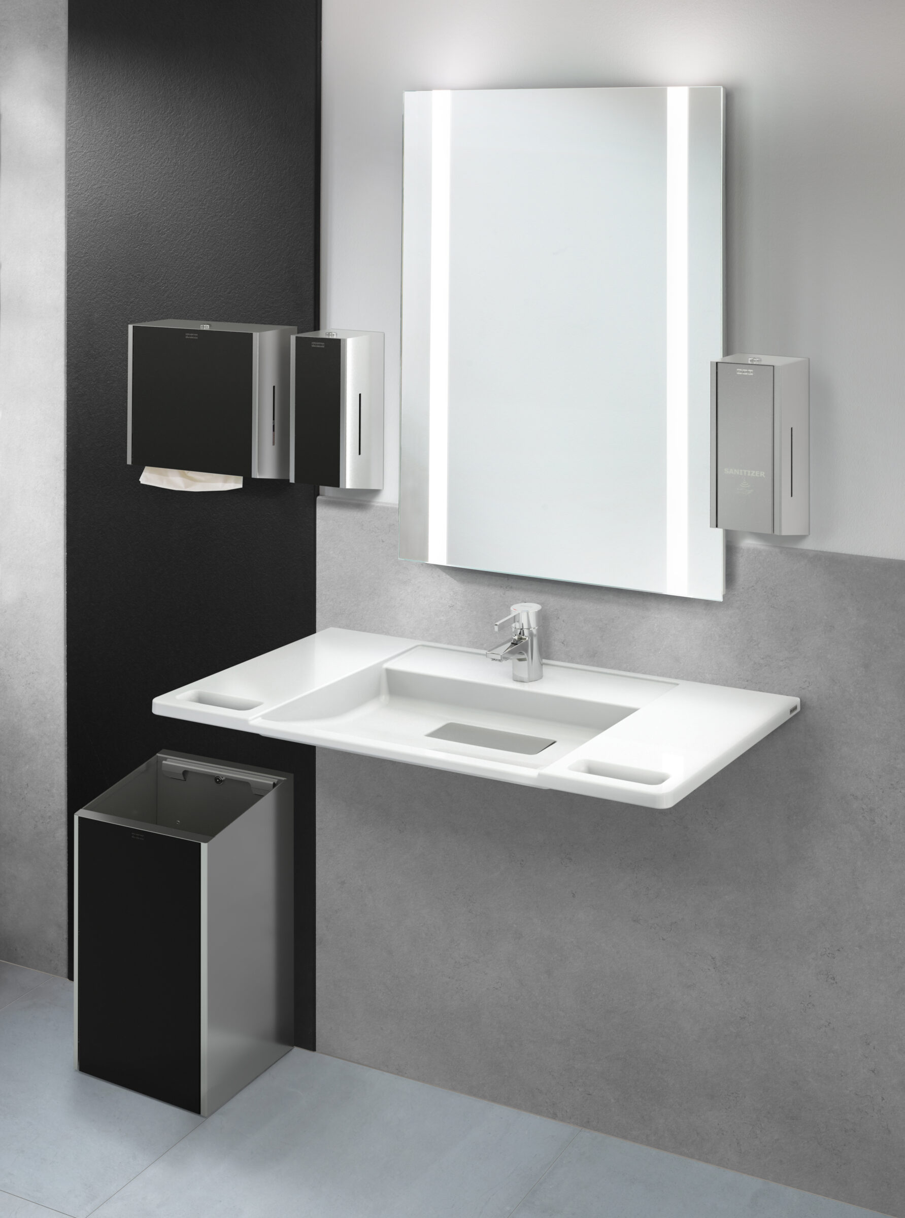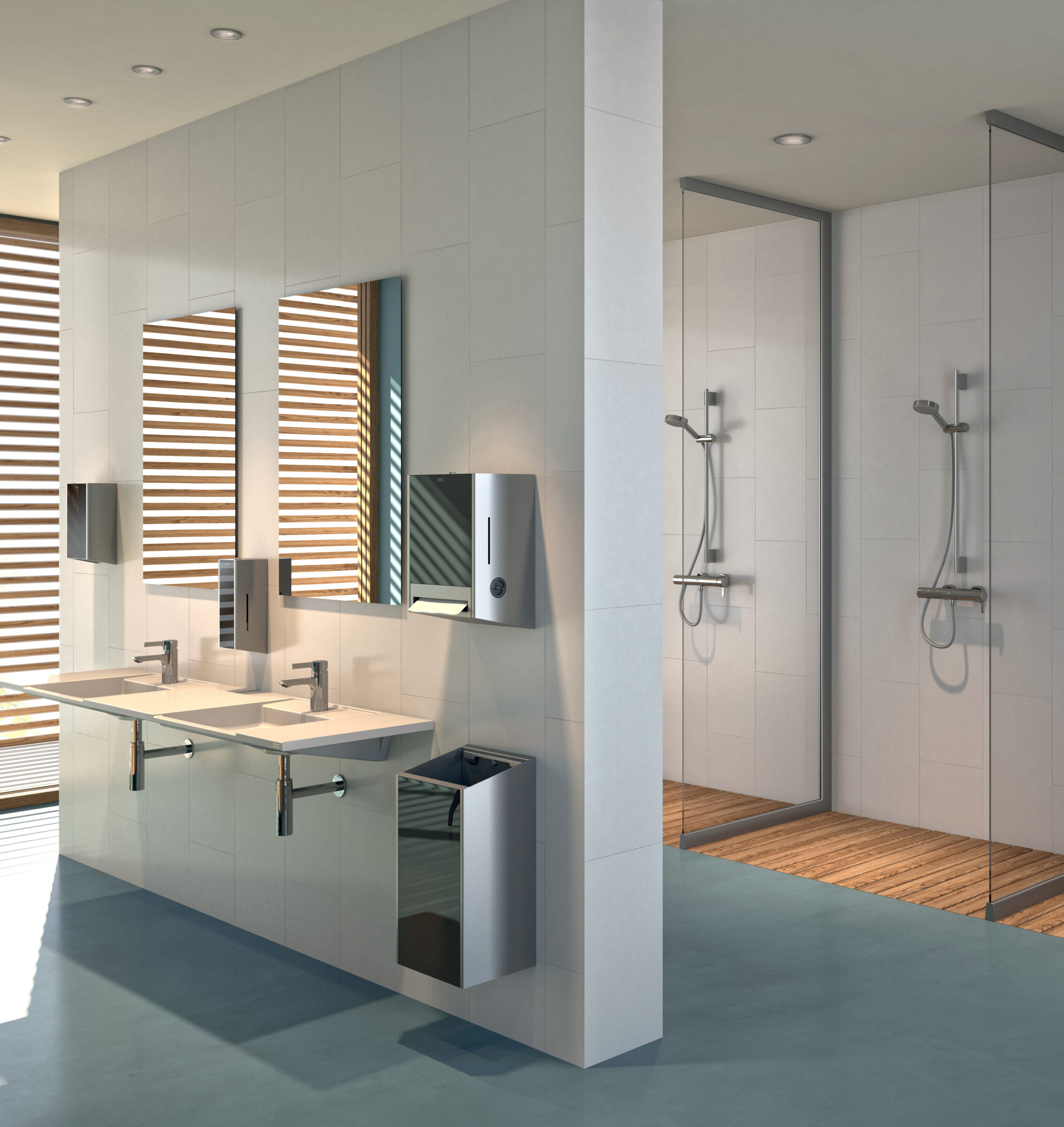 Geheel op elkaar afgestemde wastafels en accessoires zijn kenmerkend voor de nieuwe systeemlijn EXOS. van KWC. Afhankelijk van de ruimte die ter beschikking staat en het kleurconcept kunt u een keuze maken uit verschillende fronten voor zeepdispensers, handdoekautomaten en afvalemmers. Ook het aanbod aan wastafels is zeer divers.