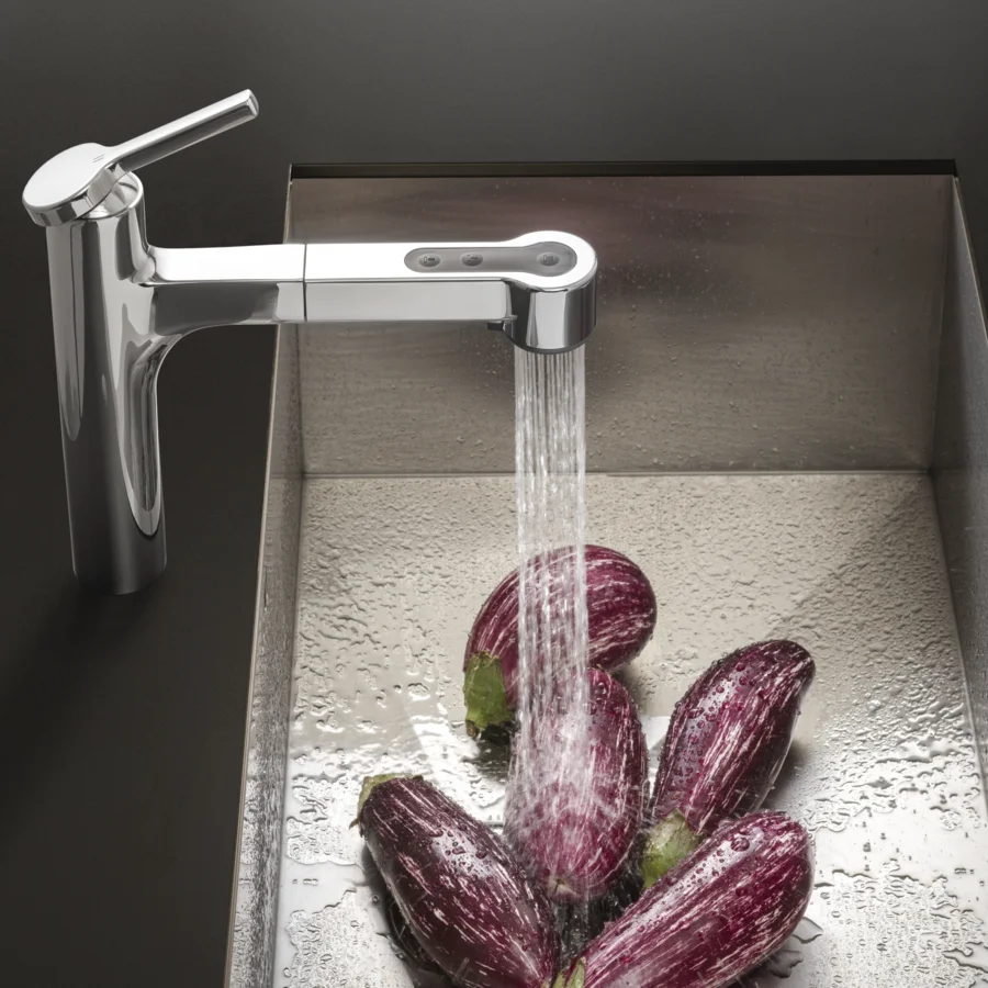 De handdouche kan tot een lengte van 600 millimeter worden uitgetrokken. De hoek van 90 graden van de afvoer ziet er elegant uit en vergroot de ruimte in de gootsteen. De platte converteerbare hendel wordt gebruikt voor het nauwkeurig instellen van de waterstraal. Hierdoor is het design net zo stijlvol als functioneel.