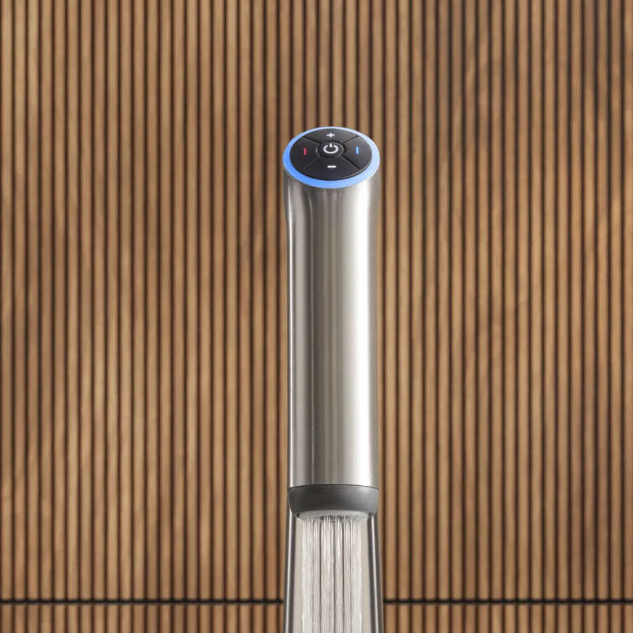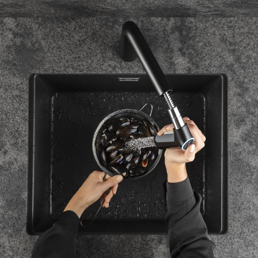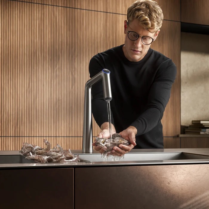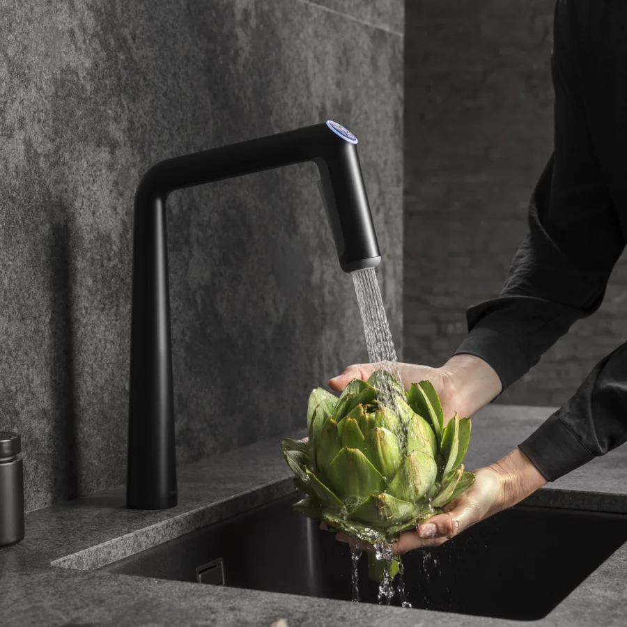 Met zijn kegelvormig lichaam en sculpturaal design brengt deze kraan zowel futuristische esthetiek als intelligente functionaliteit in de keuken.