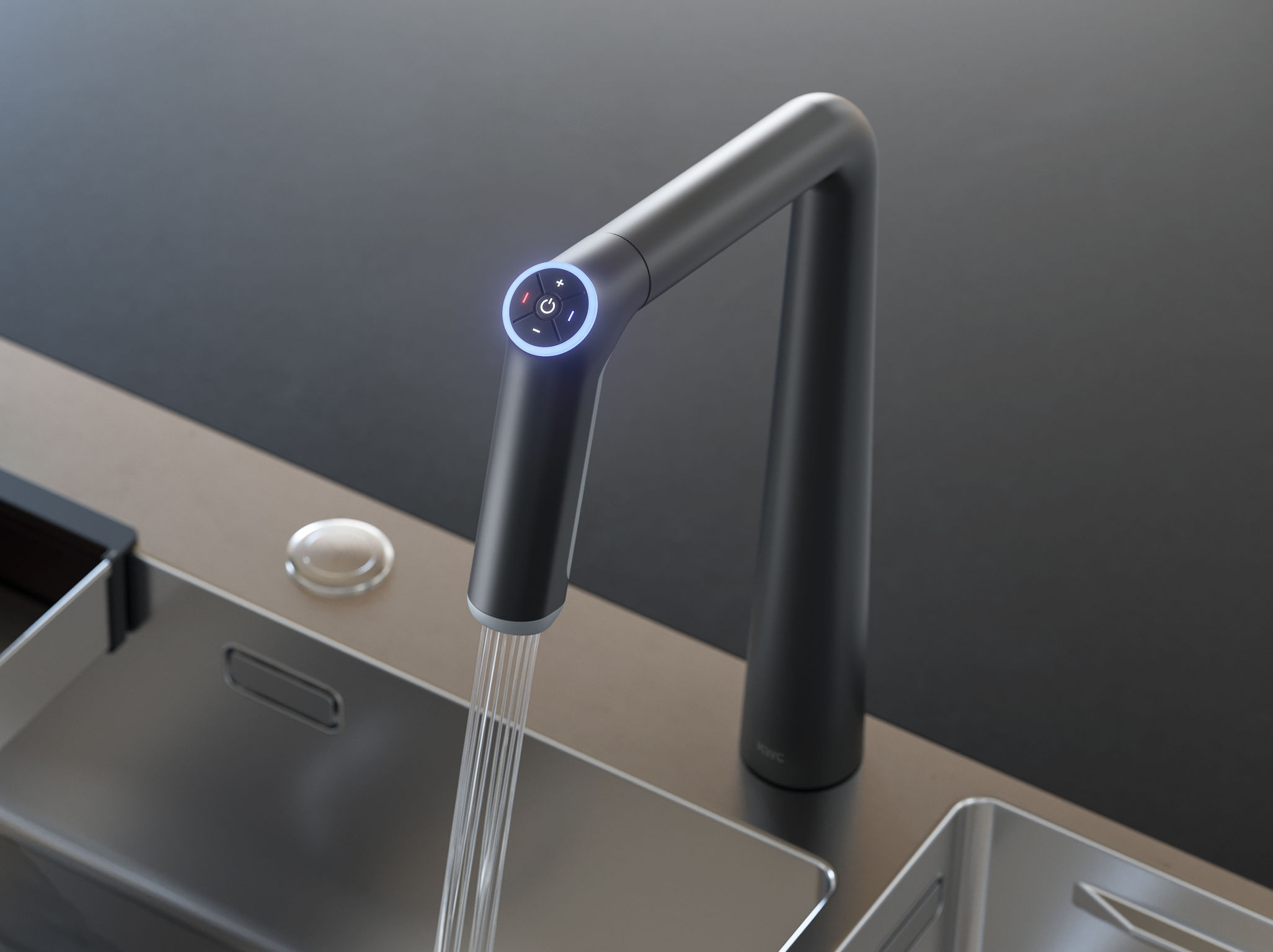 Deze elegant ogende kraan overstijgt alle verwachtingen dankzij zijn innovatief en aantrekkelijk design. De naadloze basisvormen, de nieuwe verhoudingen en de discrete verlichtingselementen trekken ogenblikkelijk de aandacht. Ook de tactiele afwerking en de moderne zwarte uitvoering in gegalvaniseerd staal zetten deze unieke kraan extra in de kijker. Zo brengt de KWC KIO op een stijlvolle manier slim wonen, gemak, hygiëne en hoogwaardig design samen.