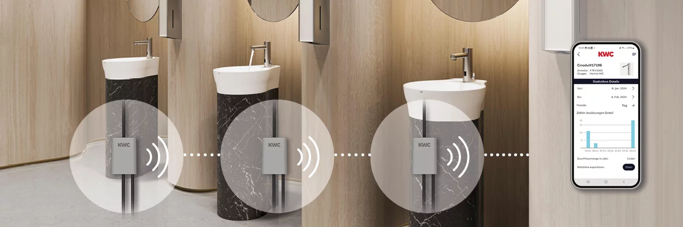 De nieuwe KWC Smart Connect App kan worden gebruikt om tot 100 kranen veilig te beheren, aangezien het  beveiligd is met een wachtwoord. Dit betekent dat gegroepeerde kraanfuncties ook mogelijk zijn per sanitair  ruimteniveau zonder extra investeringen in besturingshardware op een hoger niveau. Individuele instellingen zoals stromingstijd of sensorbereik kunnen worden geparametreerd. Algemene informatie, bijvoorbeeld over de  batterijstatus, wordt weergegeven.