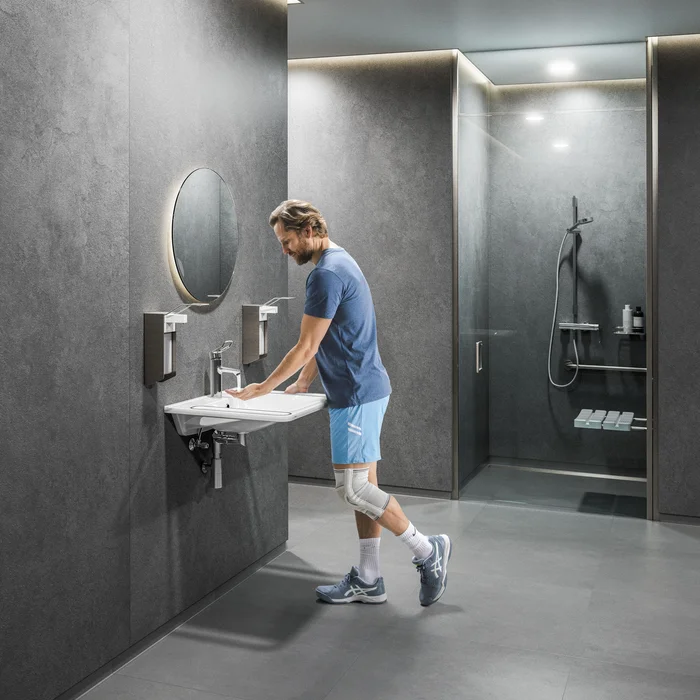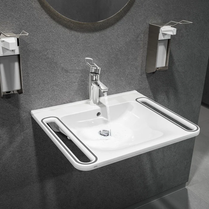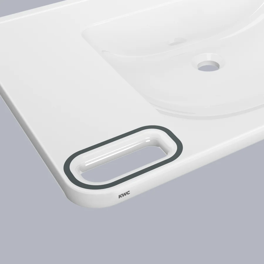 Patiënten in klinieken en zorginstellingen willen een hoge mate van zelfvoorziening en onafhankelijkheid van verzorgers tijdens hun wasroutine. De KWC MEDCARE wastafels, speciaal ontworpen voor barrièrevrije toiletten, komen tegemoet aan de behoeften van personen met een fysieke en visuele beperking. De in de zijkanten van de nieuwe KWC MEDCARE wastafels geïntegreerde verzonken handgrepen bieden gebruikers optimale ondersteuning bij het trekken en ondersteunen van zichzelf. De naadloze kleurenstroken in basaltgrijs rond de gripcontouren helpen de gebruiker om de wastafel te identificeren volgens het twee-zintuigenprincipe.