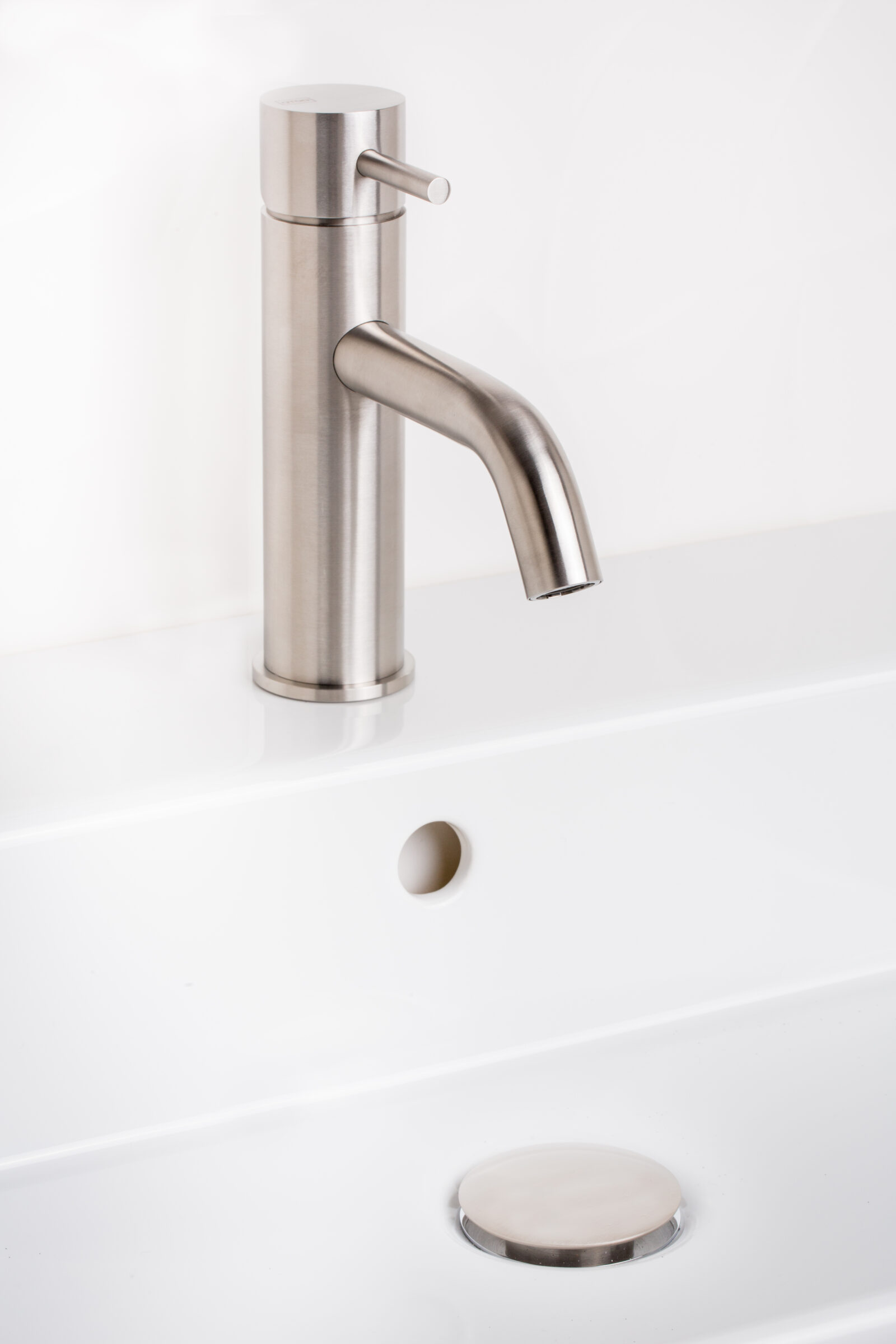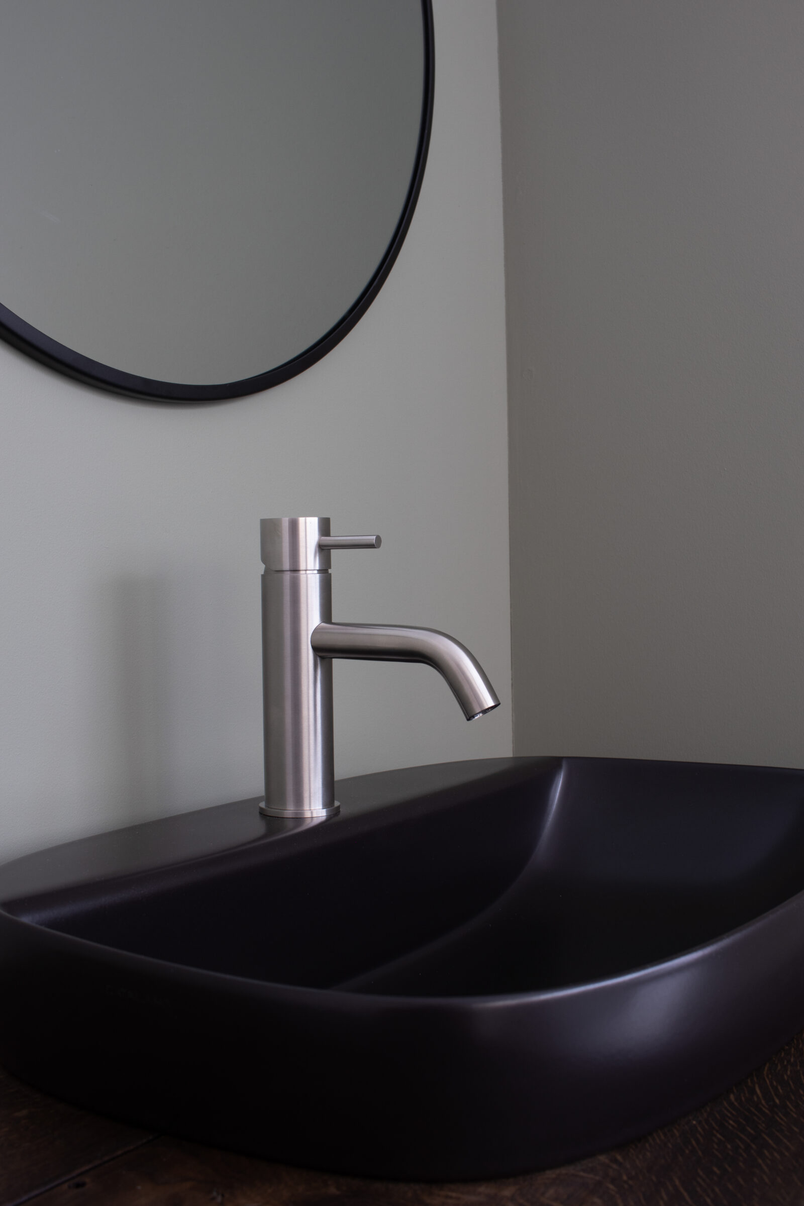 De eenvoudige, vaste, aan de wand gemonteerde Qtoo kranen voor badkamer of keuken zijn verkrijgbaar in geborsteld en gepolijst roestvrij staal of slank matzwart, naast – en los van – de bijbehorende gebogen kraanuitlopen. De pin van elk model is naar beneden gericht in de ‘off’-stand, zodat het water niet in de hendel loopt en zo verstoppingen of kalkaanslag kan veroorzaken.