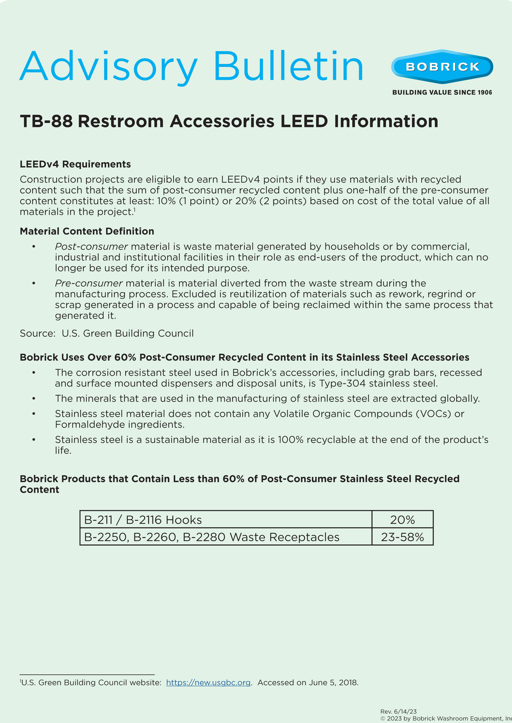 Bobrick TB-88 toiletaccessoires LEED-informatie
