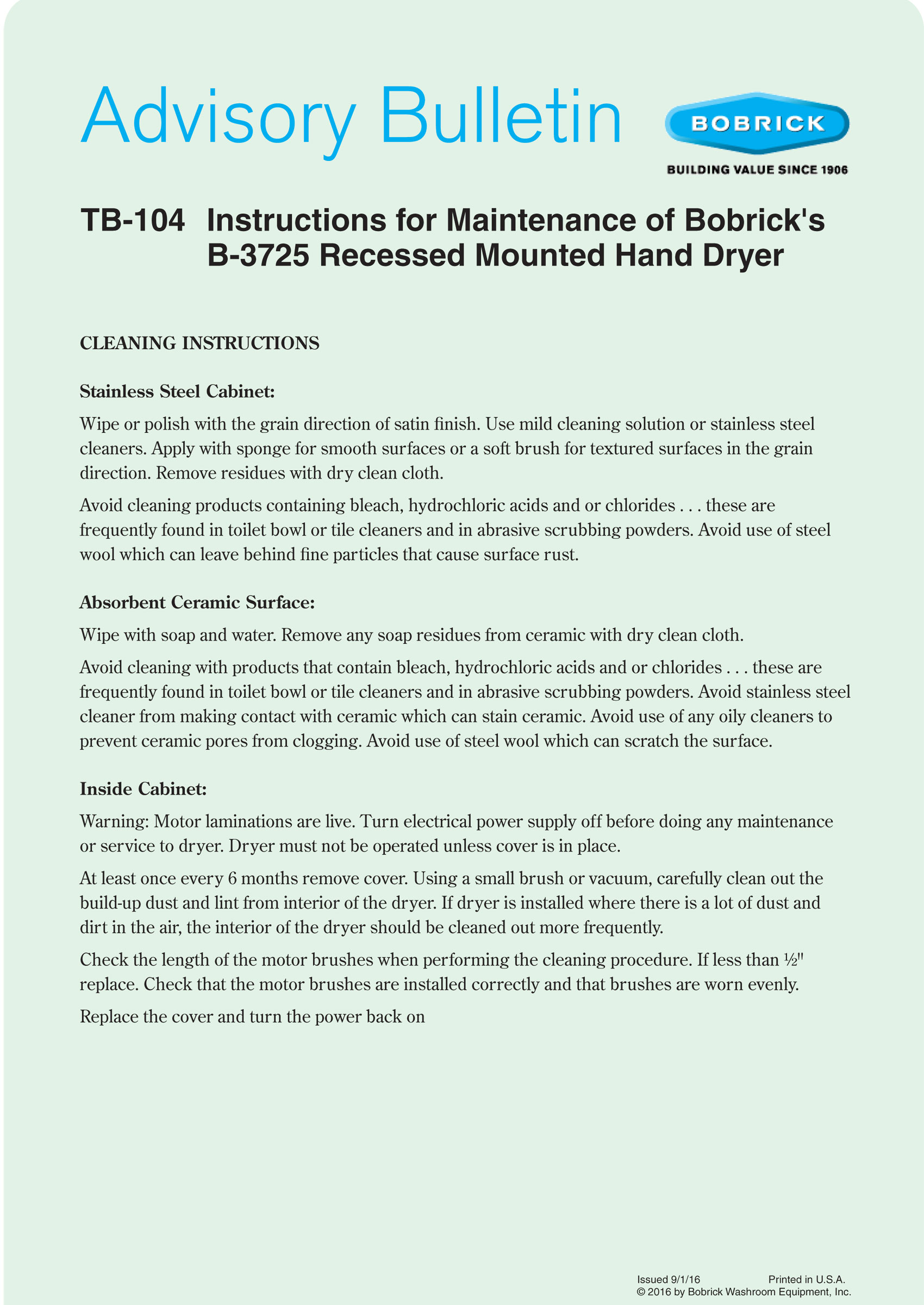 Bobrick TB-104 Instructies voor het onderhoud van Bobrick's B-3725 inbouw handdroger