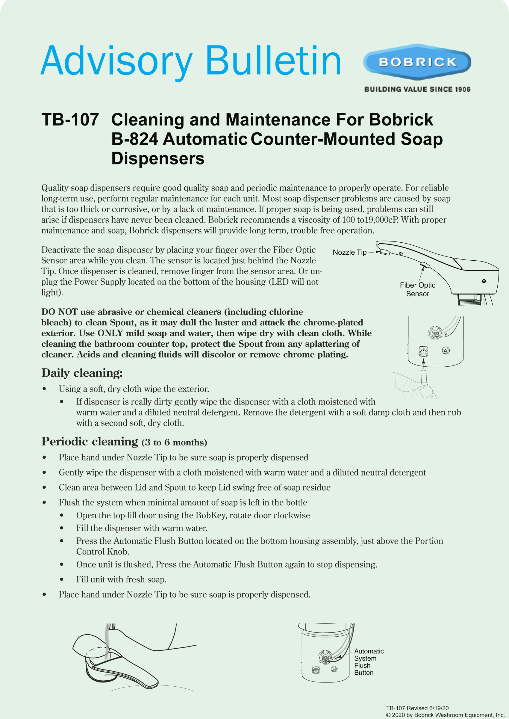 Bobrick TB-107 Reiniging en onderhoud voor Bobrick B-824 zeepautomaten voor montage in wastafels