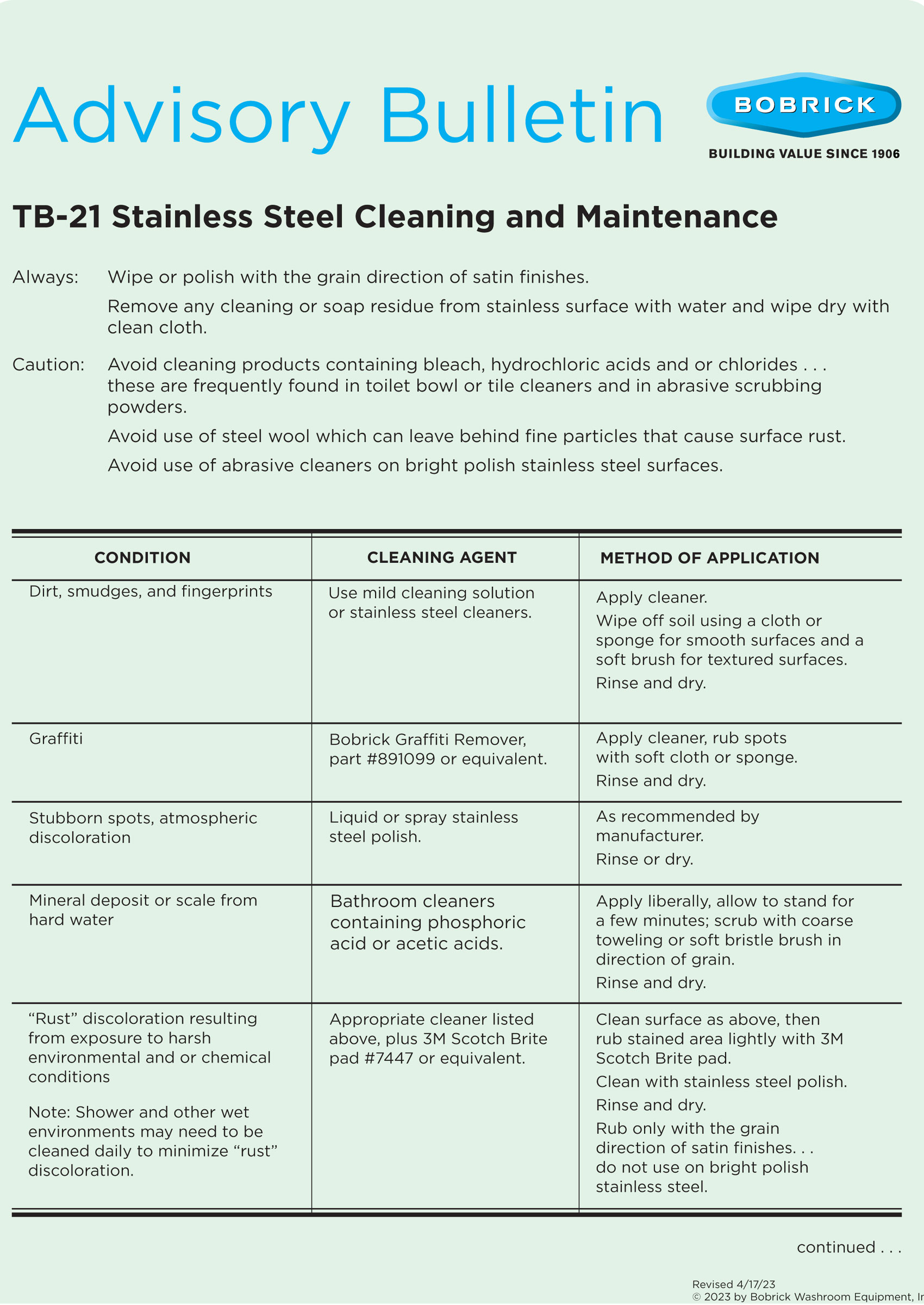 Bobrick TB-21 Roestvrij Staal Reiniging en Onderhoud