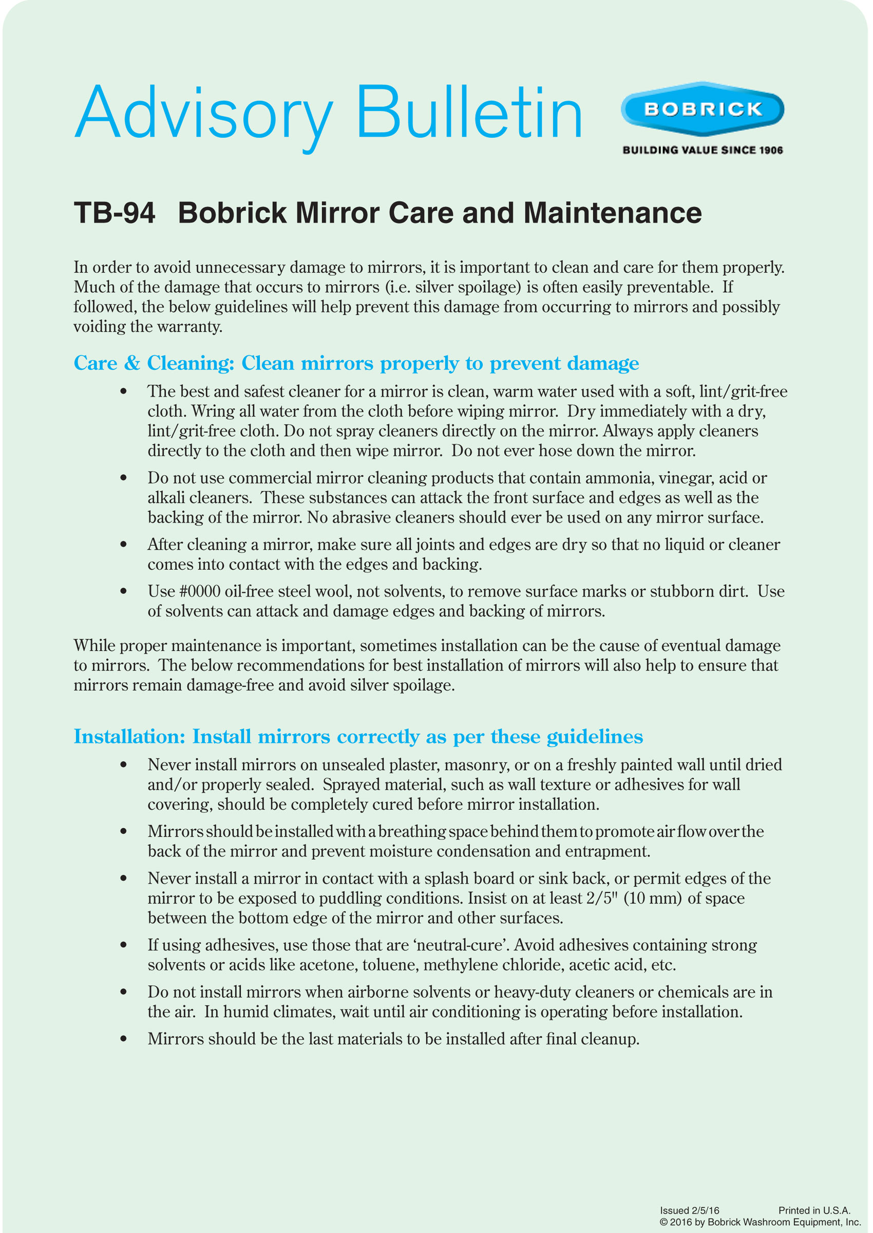Bobrick TB-94 Spiegel Verzorging en Onderhoud