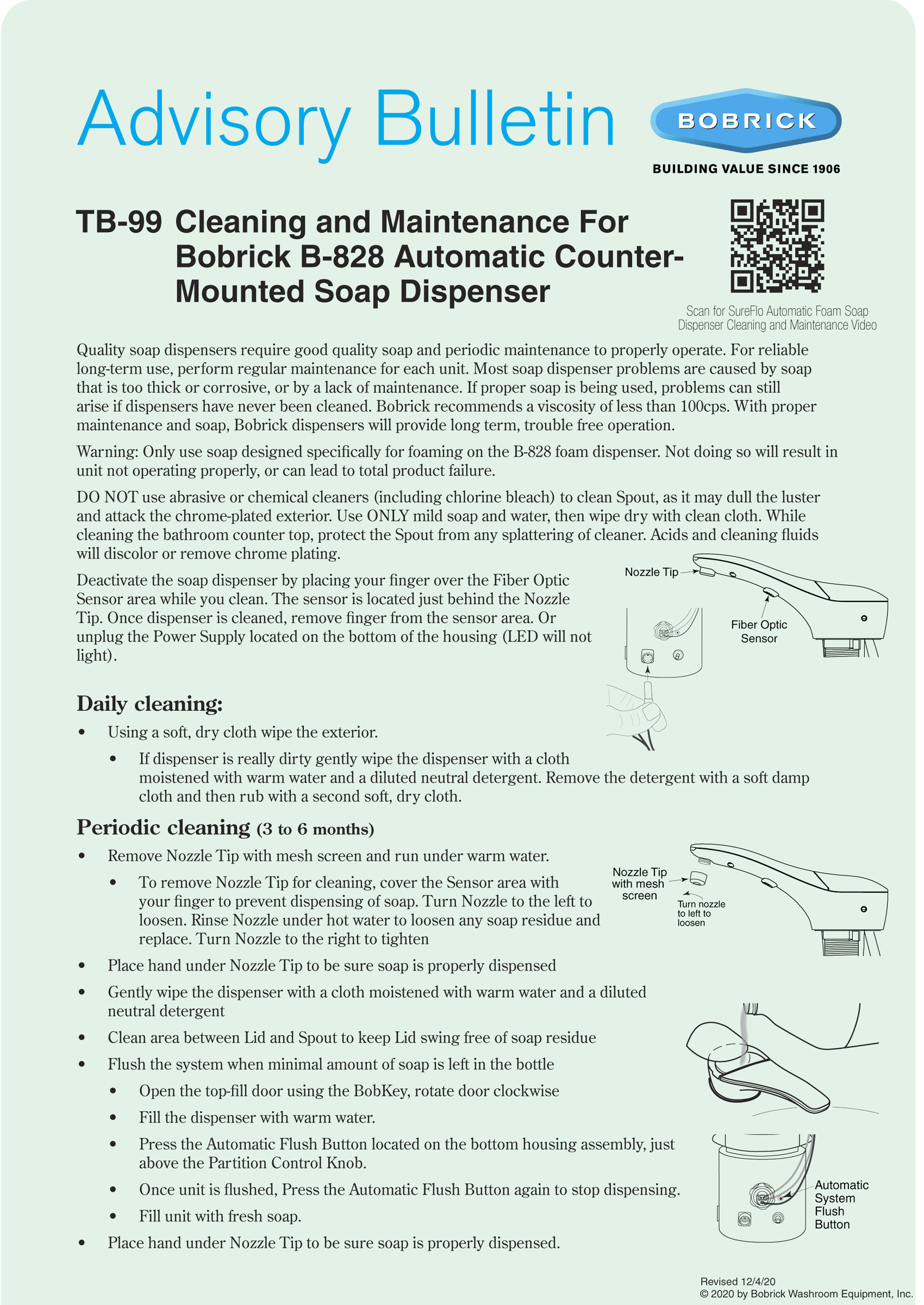 Bobrick TB-99 Reiniging en onderhoud voor Bobrick B-828 zeepautomaat voor montage in wastafels