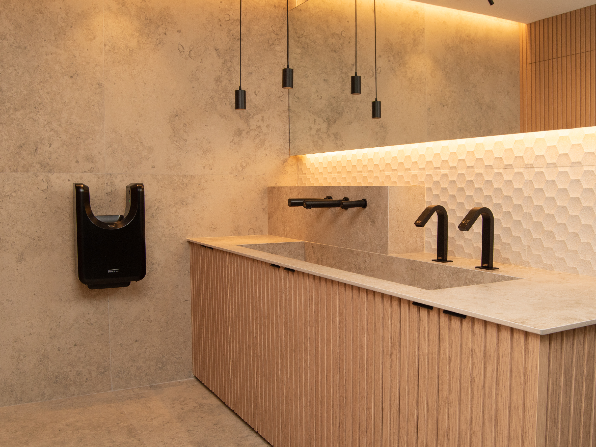 All-in-One is de innovatieve oplossing van Mediclinics waarmee u uw handen kunt inzepen, spoelen en drogen bij dezelfde wastafel. Met het Mediclinics All-in-One station wordt het concept van handen wassen en drogen in een openbaar toilet volledig veranderd, aangezien de wastafel zelf de zeepdispenser, de waterkraan en de handendroger bevat. Was- en droogunit Mediclinics® All-in-one, bestaande uit een handendroger + een waterkraan + een zeepdispenser, allemaal sensorgestuurd en klaar voor wandmontage. De nieuwe zwarte lijn van All-in-One is geïnspireerd op de elegantie en soberheid die zwart in elke omgeving brengt, waardoor badkamerruimtes een exclusief en modern design krijgen.