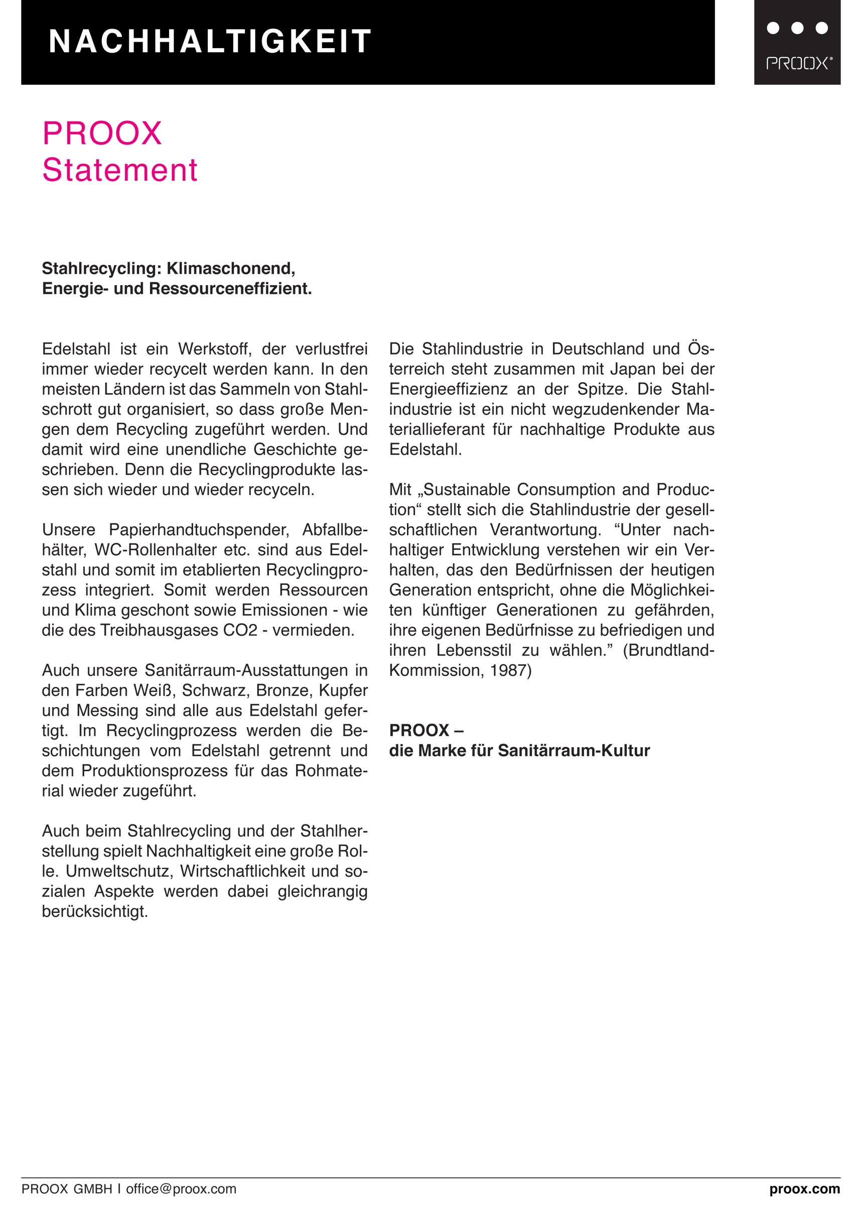 PROOX onderscheidt zich door zich te richten op design, duurzaamheid en gebruiksvriendelijkheid. De producten van PROOX worden vaak gebruikt in commerciƫle en openbare ruimtes, zoals restaurants, kantoren, luchthavens en ziekenhuizen, waarbij de focus ligt op hygiƫne en een professionele uitstraling.