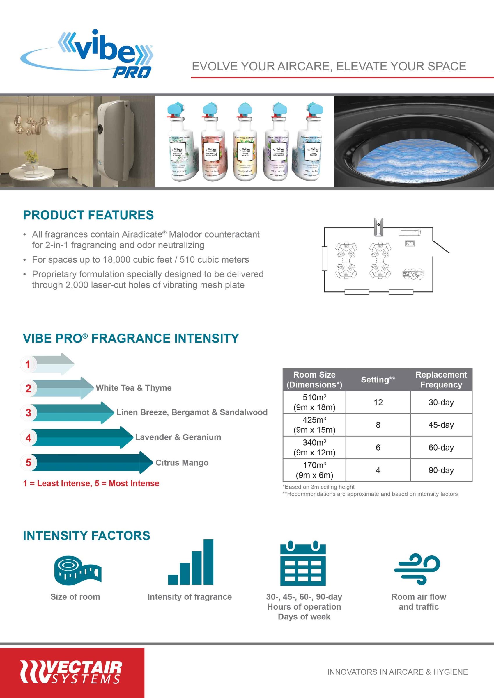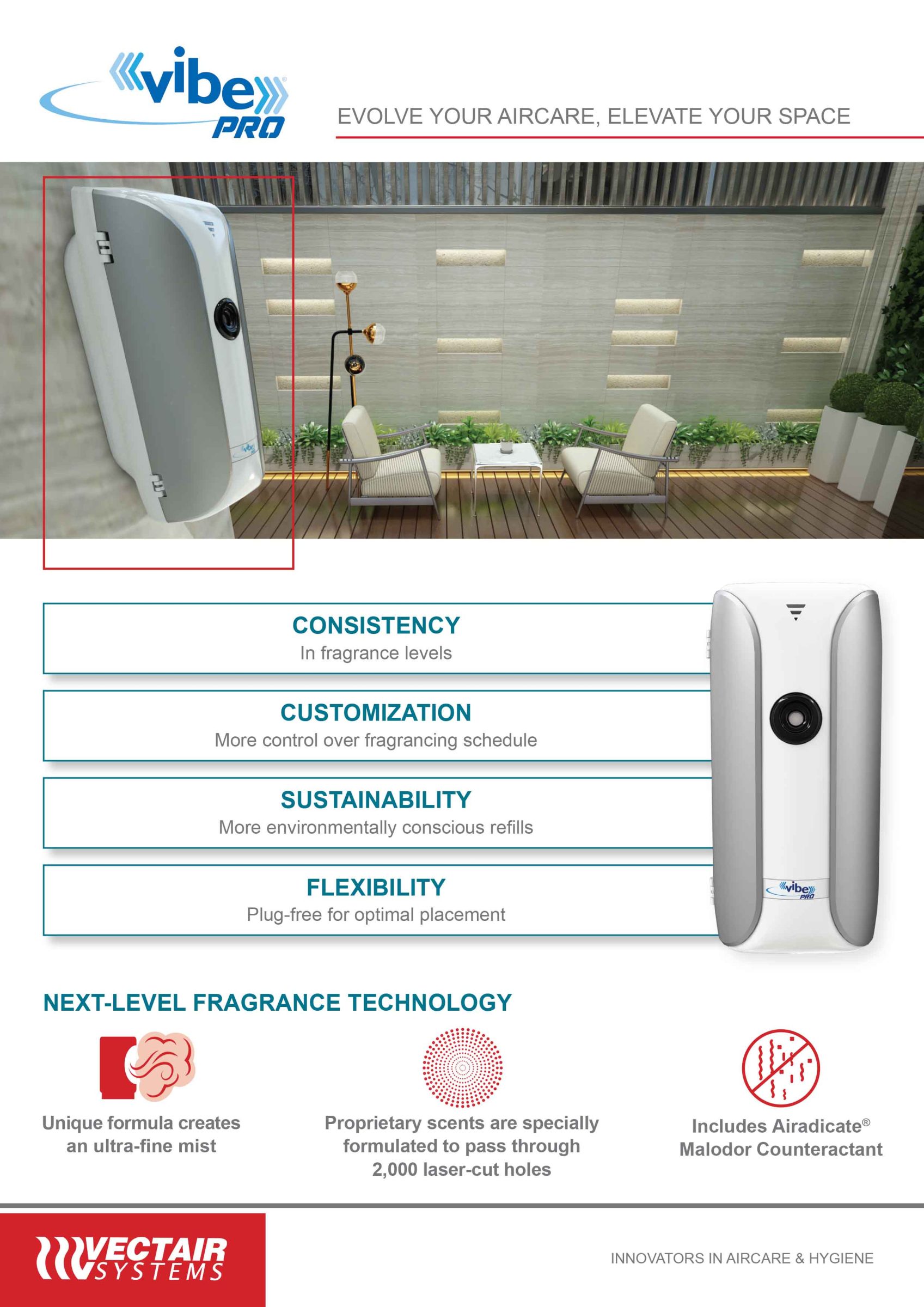 De nieuwste innovatie op het gebied van gedoseerde luchtverzorging van Vectair Systems, Vibe Pro, biedt gepatenteerde Vibrerende Mesh Technologie die een ultrafijne nevel creëert voor een meer consistente geurbeleving in uw ruimte.